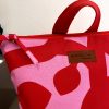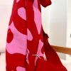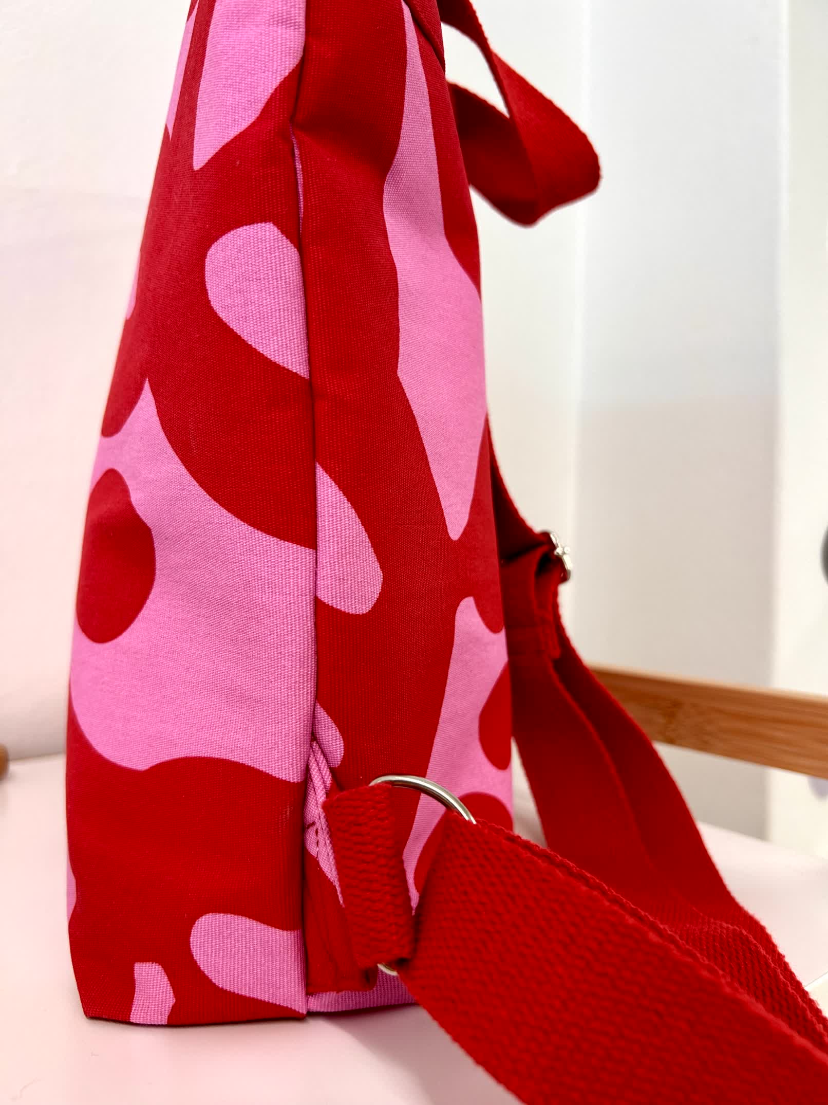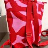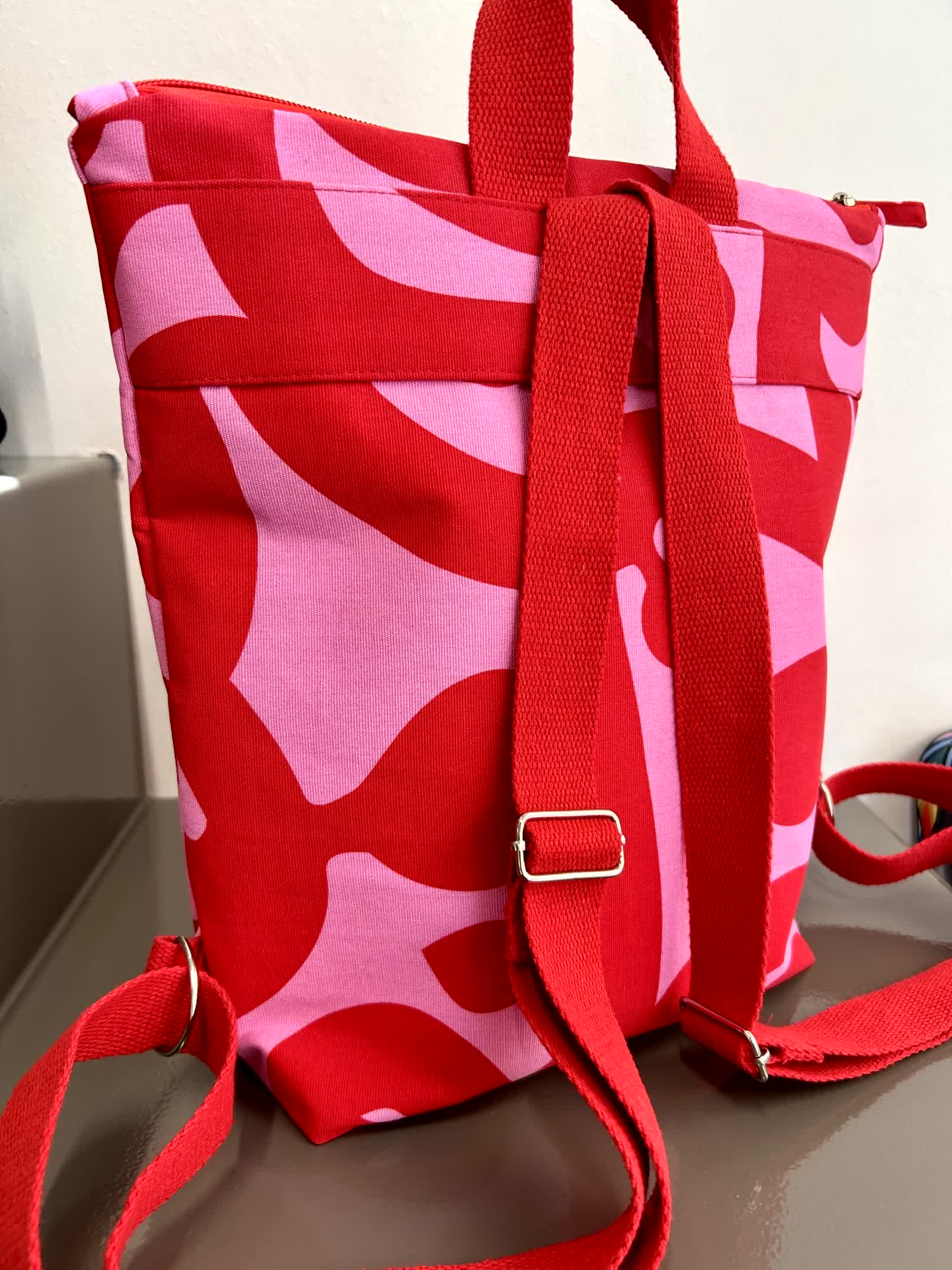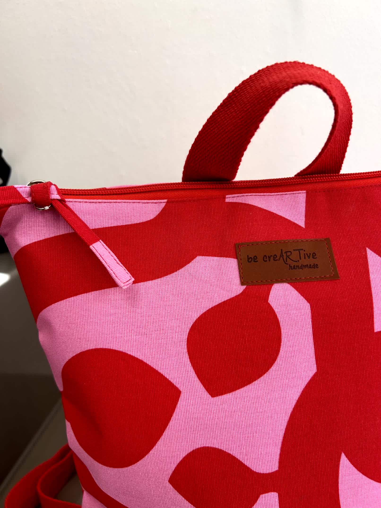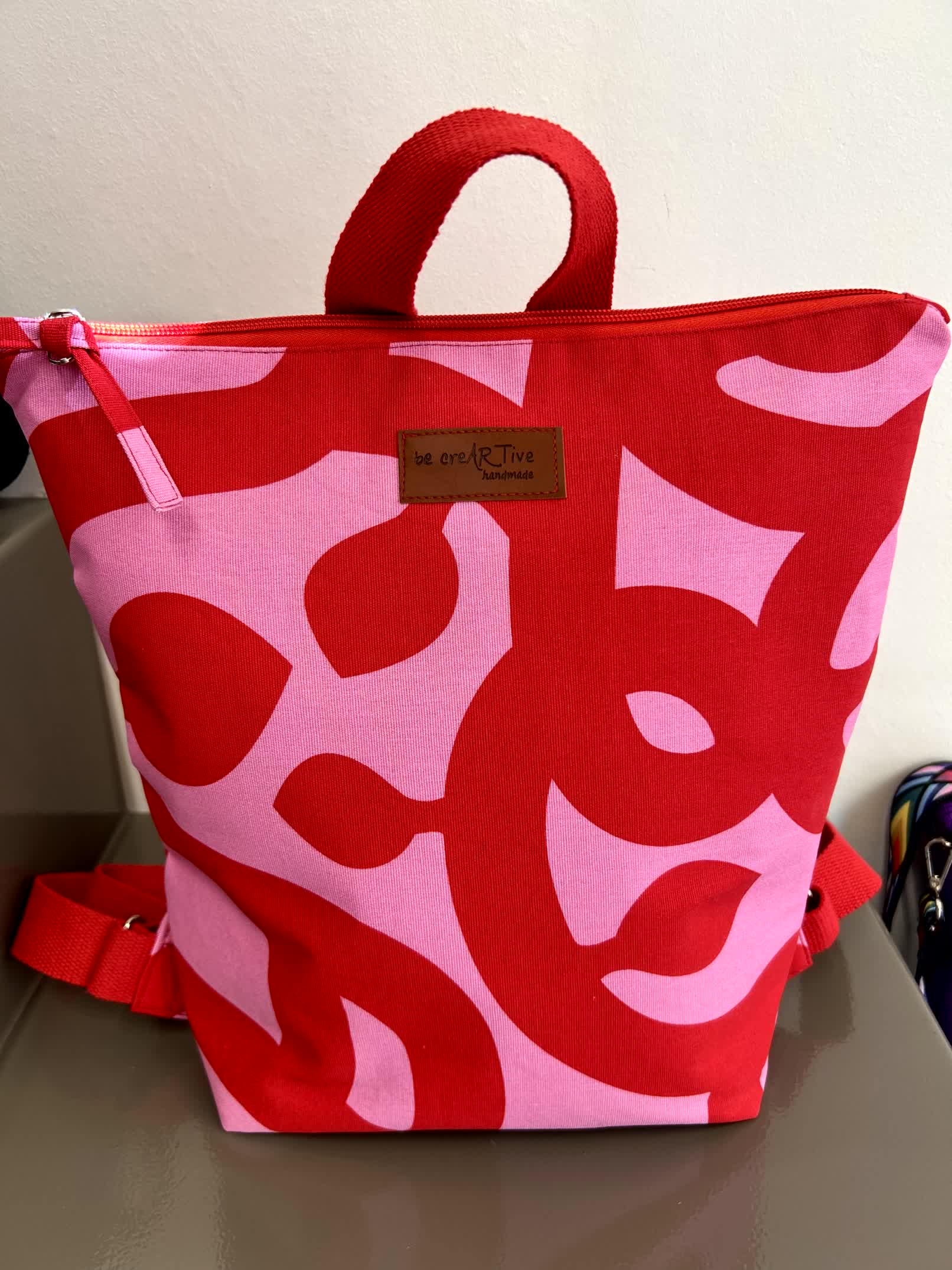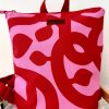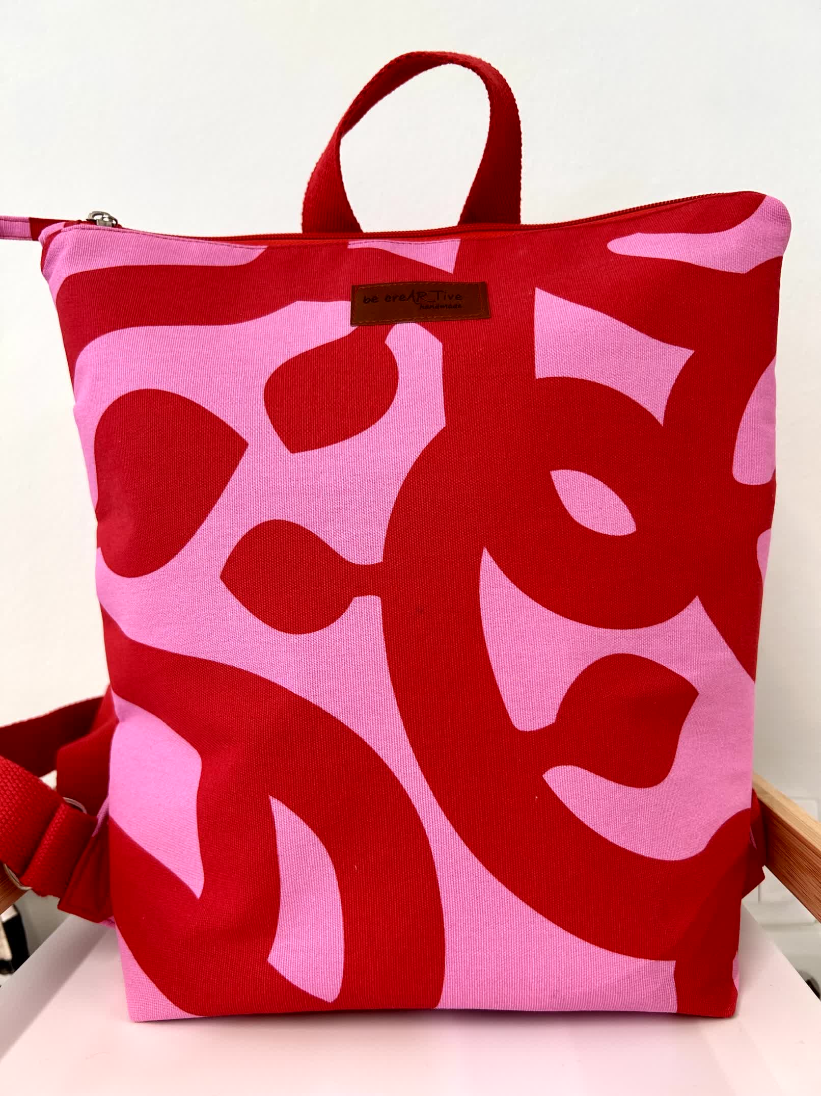 Ένα εντυπωσιακό χειροποίητο σακίδιο πλάτης σε δυναμικό συνδυασμό κόκκινου και ροζ, με αφηρημένο μοτίβο που ξεχωρίζει.
