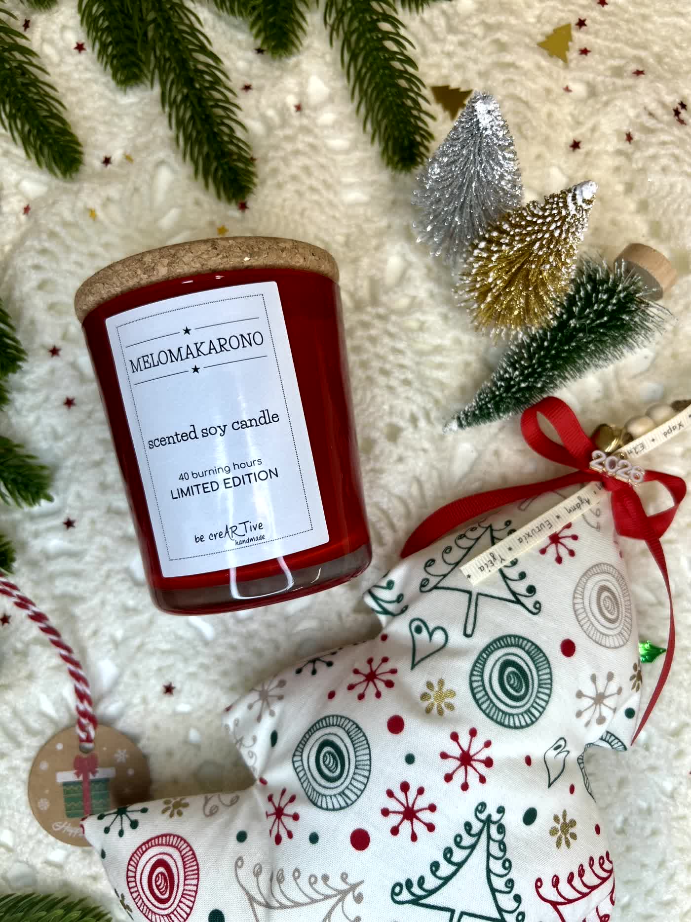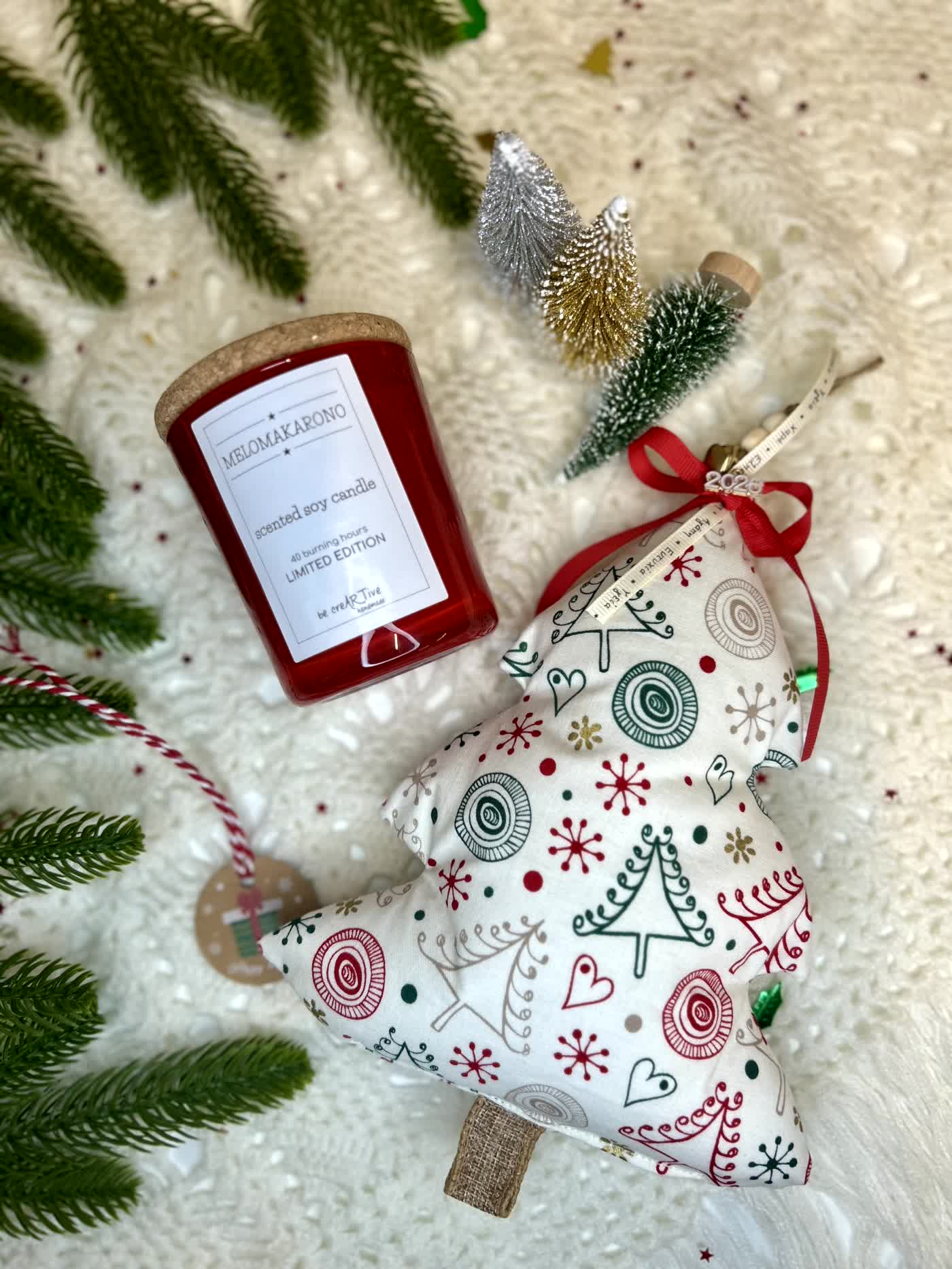 Κάθε κουτί κρύβει ένα χειροποίητο στολίδι γούρι για το 2026 και συνδυάζεται με κερί σόγιας με άρωμα μελομακάρονο ή κεραμική κούπα ή σετ δύο χριστουγεννιάτικων scrunchies .