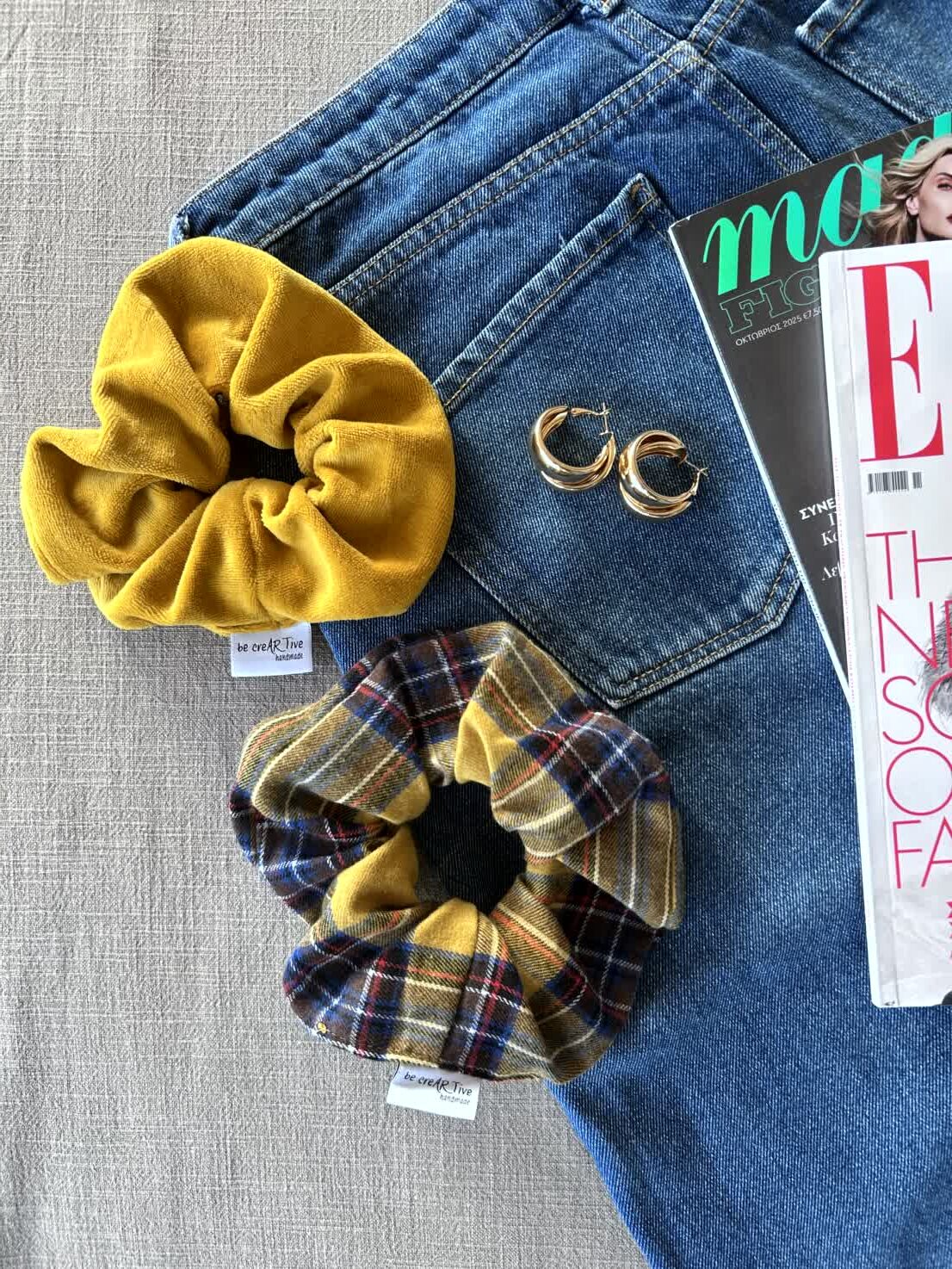 Υφάσματα: Βελούδο μουσταρδί & καρό με navy-κόκκινες λεπτομέρειες