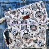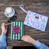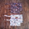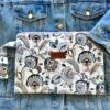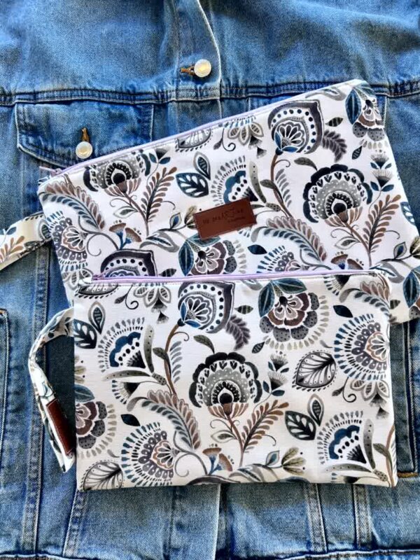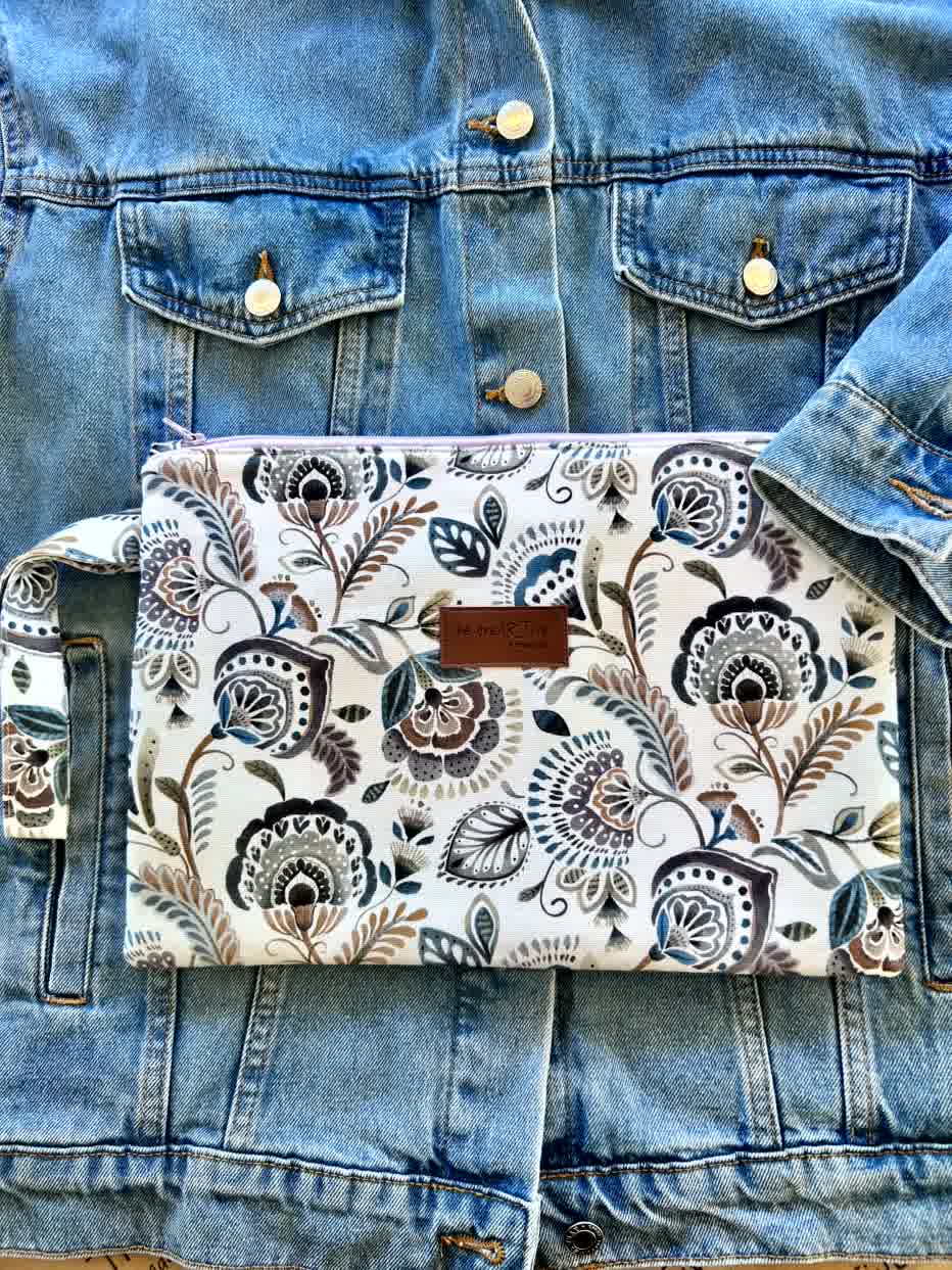 Πλακέ τσαντάκι με boho floral μοτίβο σε λευκό φόντο, χερούλι από το ίδιο ύφασμα και φερμουάρ.