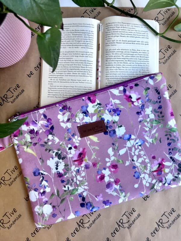 Πλακέ τσαντάκι με φλοράλ μοτίβο σε απαλές αποχρώσεις ροζ και μπεζ. Χερούλι από το ίδιο ύφασμα, φερμουάρ και εσωτερική φόδρα.