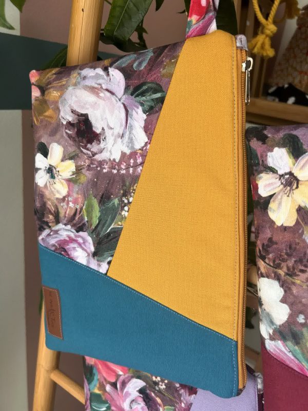 Ένα κομψό και πρακτικό χειροποίητο τσαντάκι που ξεχωρίζει για το ιδιαίτερο floral ύφασμα της συλλογής  «Χρώμα… για να ανθίζεις» και για τον ιδιαίτερο γεωμετρικό συνδυασμό με τα μονόχρωμα υφάσματα .