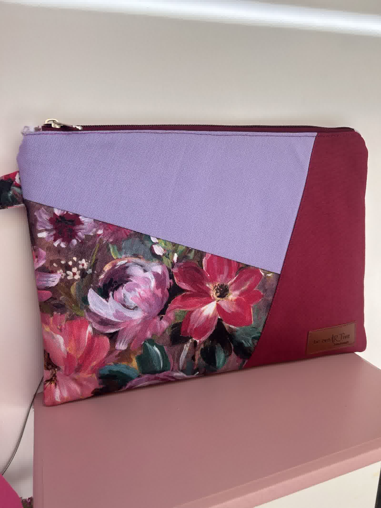 Ένα κομψό και πρακτικό χειροποίητο τσαντάκι που ξεχωρίζει για το ιδιαίτερο floral ύφασμα της συλλογής  «Χρώμα… για να ανθίζεις» και για τον ιδιαίτερο γεωμετρικό συνδυασμό με τα μονόχρωμα υφάσματα .
