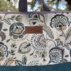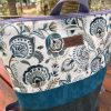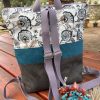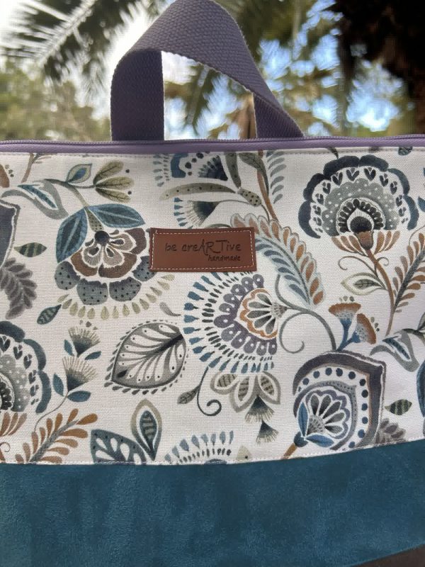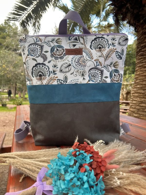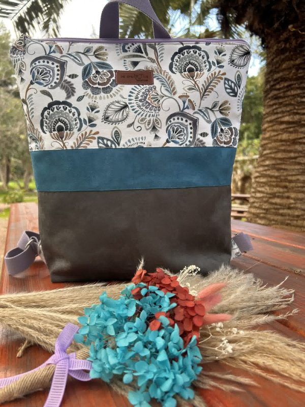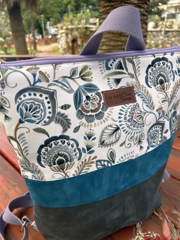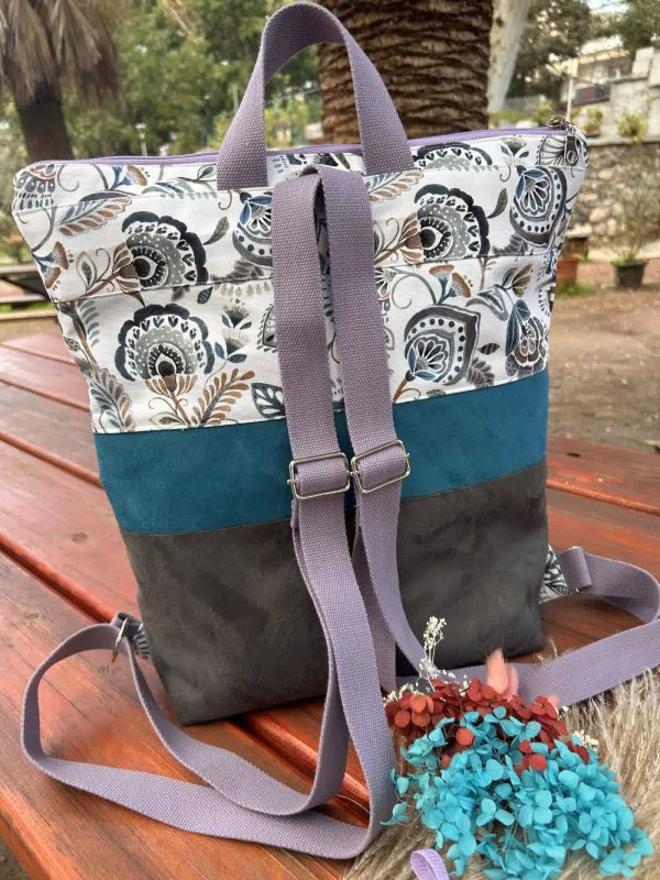 Σακίδιο πλάτης από ανοιχτό floral καμβά με συνδυασμό πετρόλ και γκρι σουέτ.