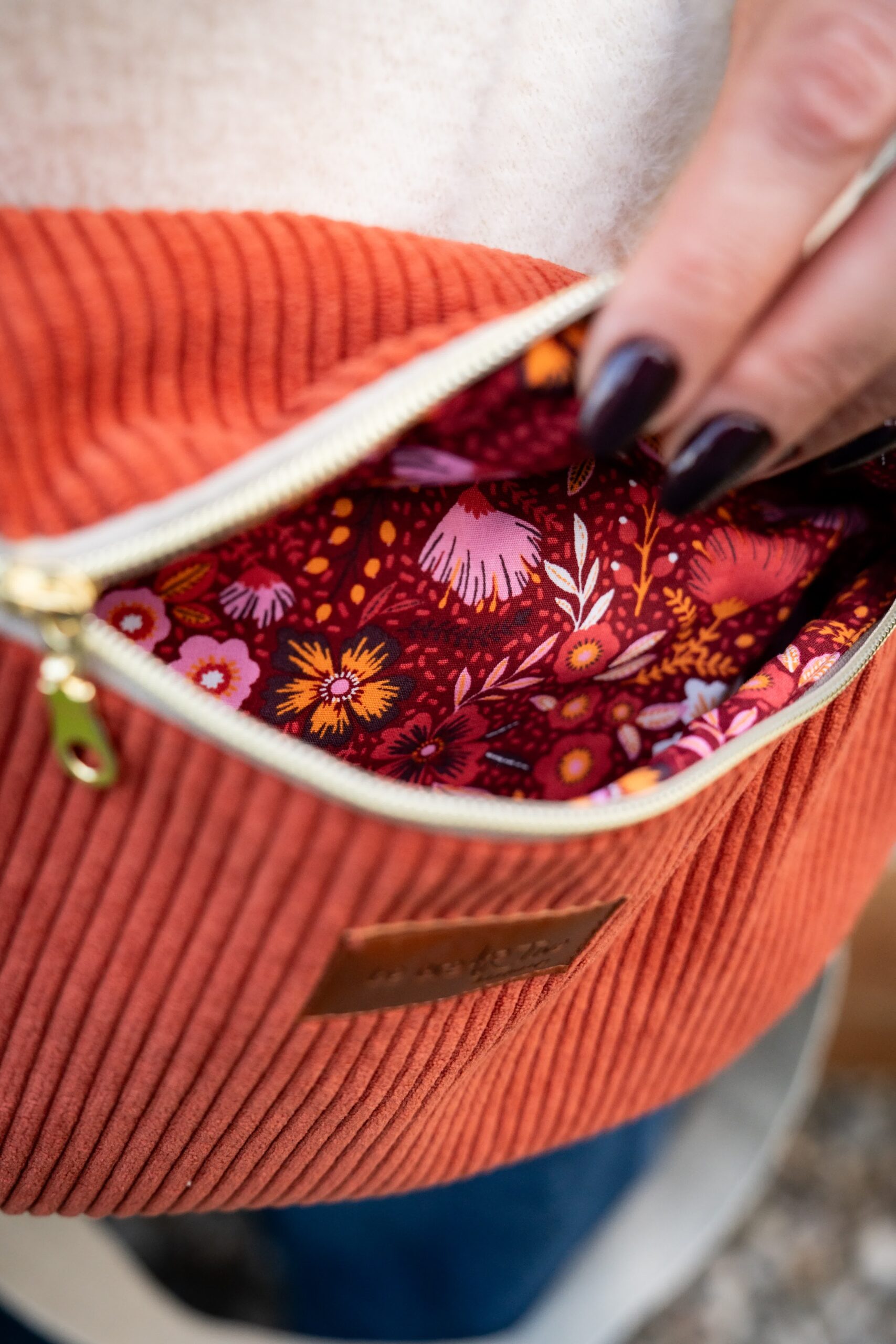 Ζεστό και διαχρονικό, το Cinnamon Cord belt bag φτιαγμένο από απαλό κοτλέ ύφασμα στην απόχρωση της κανέλας, συνδυάζει casual στυλ με κομψή απλότητα.