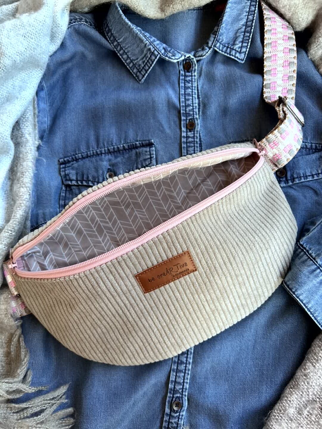 Κατασκευασμένη από μαλακό βαμβακερό κοτλέ ύφασμα με ενίσχυση, διαθέτει ευρύχωρο εσωτερικό με παιχνιδιάρικη βαμβακερή φόδρα, φερμουάρ διπλής κατεύθυνσης και ρυθμιζόμενο ιμάντα. Φοριέται χιαστί ή στη μέση και προσαρμόζεται εύκολα σε κάθε στυλ.